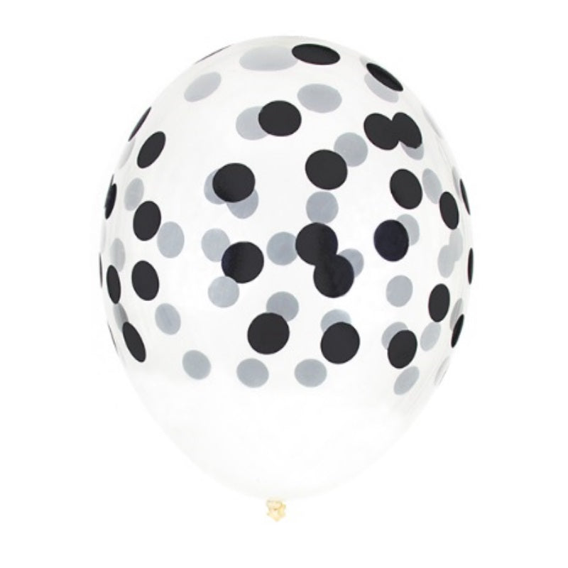 Mustalla tai hopealla konfetilla koristeltu kumipallo. Konfetit on printattu läpinäkyvään palloon.